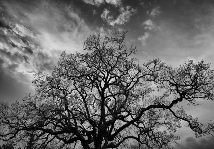 SONOMA SKY — Dec 27 2022. Silhouetted oak tree behind a Taco Bell, Lomita Avenue, Sonoma, California. Nikon Z7ii. Nikkor S 24-70mm f/4 Z lens, 1/500s, f/8, ISO 100. Monochrome.